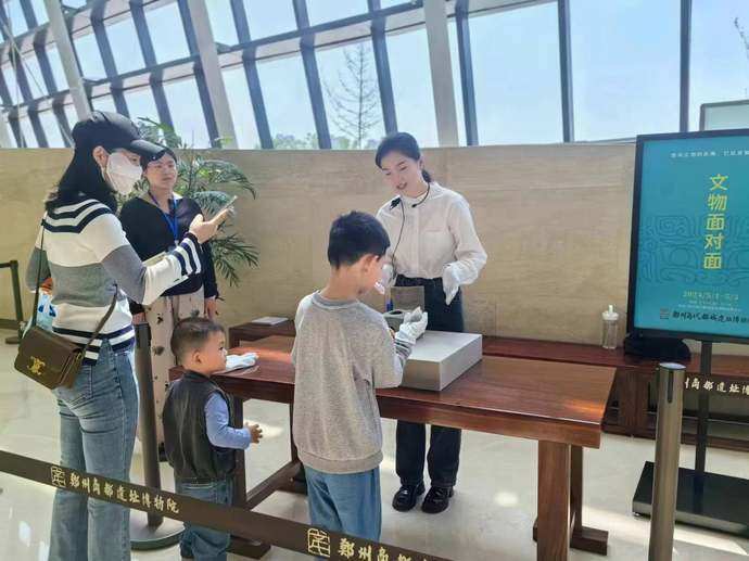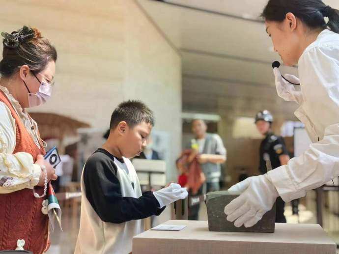 5月1日上午10时,博物院南大厅里聚集了一群游客,他们排着整齐的长队,等待触摸尘封的文物,聆听文物的“声音”。家在新密的李女士一大早就带着一家老小来到博物院,她说:“平时都是隔着玻璃展柜看文物,能和文物零距离接触的机会不多,得知有这个活动,我就动员了家人一起来。”本次“文物面对面”活动充分实现馆藏文物“动”起来。活动分三天让游客触摸陶灶、铜镜和商城夯土块等珍贵文物,文物保管专员现场讲解文物背后的历史密码,文博爱好者们也可以近距离观察文物的“肌理”,感受文物的质感。