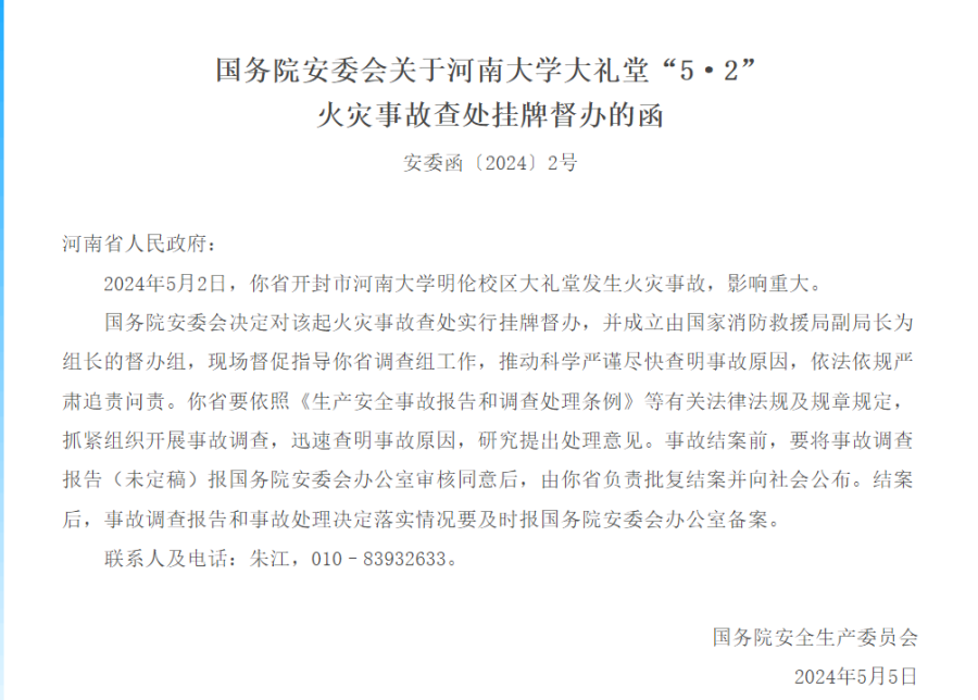 据应急管理部5月6日消息,国务院安委会发布关于河南大学大礼堂“5·2”火灾事故查处挂牌督办的函。