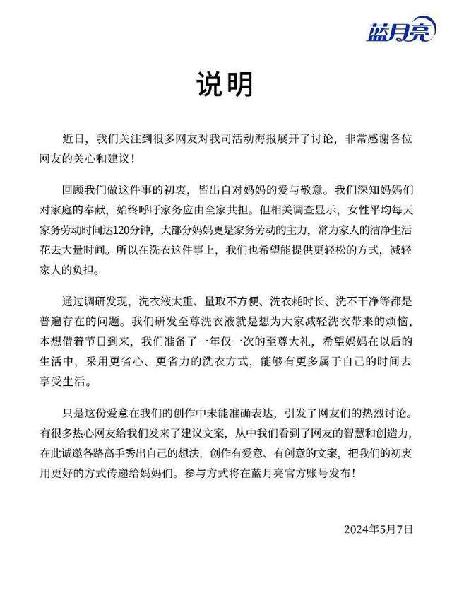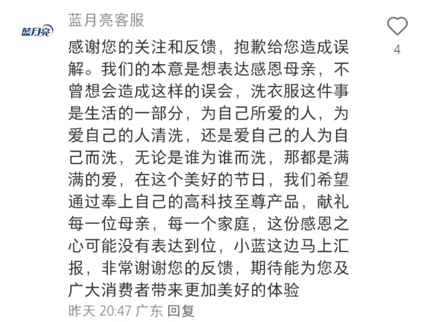5月5日晚,蓝月亮客服也于社交平台做出解释,蓝月亮客服称,广告文案本意是想表达感恩母亲,不曾想会造成这样的误会,洗衣服这件事是生活的一部分,为自己所爱的人,为爱自己的人清洗,还是爱自己的人为自己而洗,无论是谁为谁而洗,那都是满满的爱。“在这个美好的节日,我们希望通过奉上自己的高科技至尊产品,献礼每一位母亲,每一个家庭,这份感恩之心可能没有表达到位”,蓝月亮客服补充道。