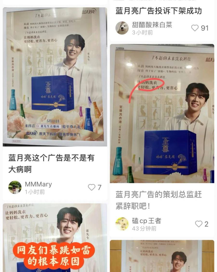 据社交平台网友反映,蓝月亮一则张贴在电梯里的母亲节海报文案遭吐槽,其内容所述“让妈妈洗衣 更轻松、更省力、更省心”,以及相关洗衣产品礼盒包装上印刷的“妈妈 您先用”字样被认为是对女性的刻板印象,此外海报背景所配图案为独自做家务、照顾孩子、工作的女性剪影,也引发部分消费者不适。