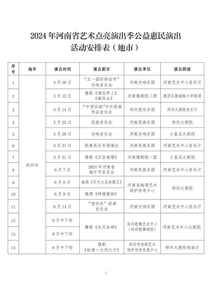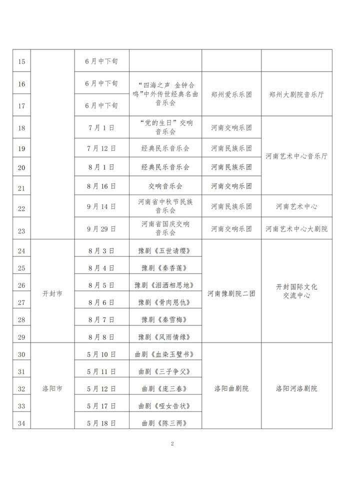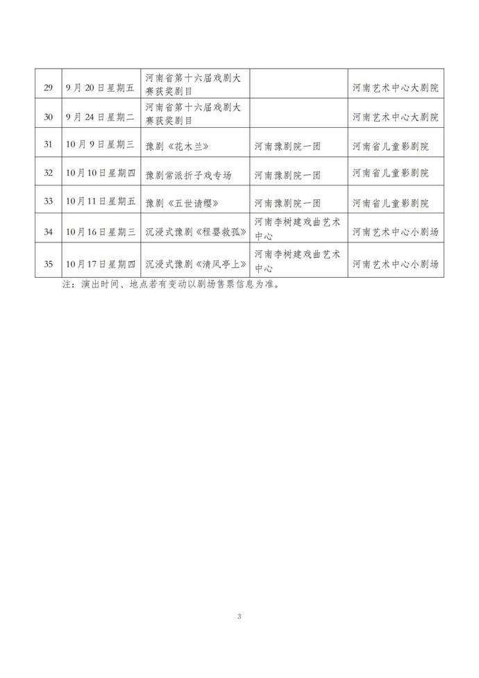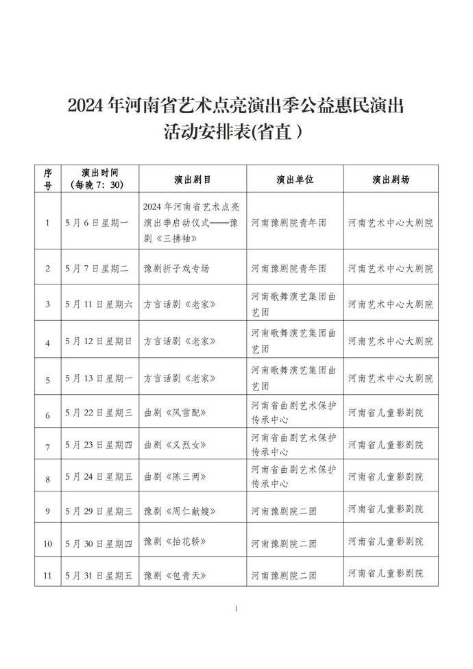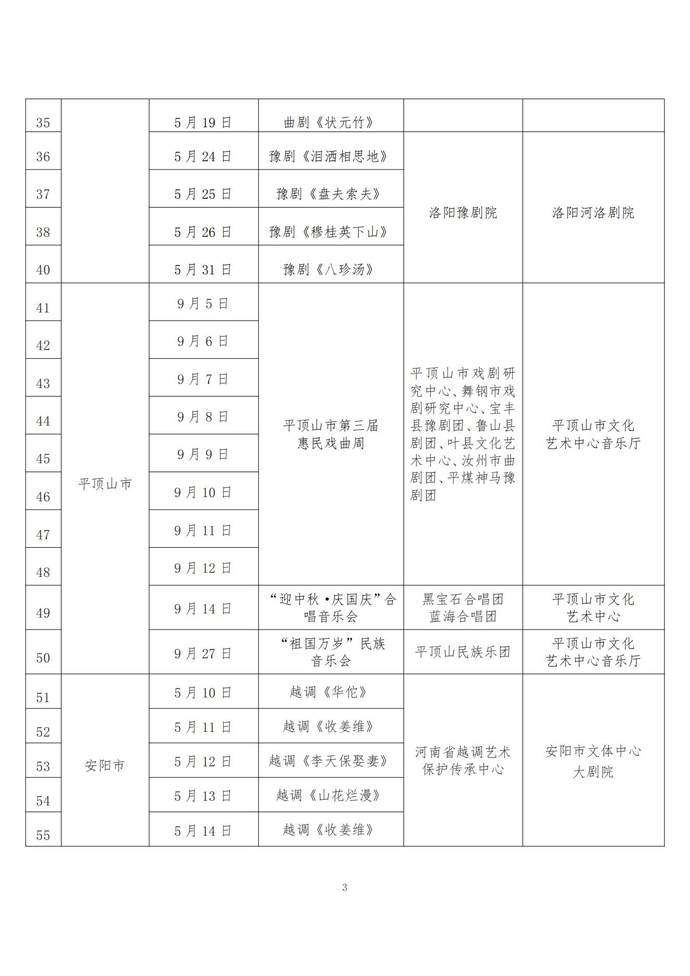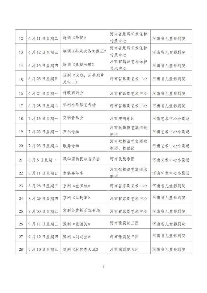 演出精选经典剧目、新创剧目、折子戏专场、音乐会、诗歌朗诵会、歌舞专场、声乐专场、木偶专场、沉浸式演出等不同艺术形式,涵盖豫剧、曲剧、越调、京剧、话剧等多个剧种,将为全省人民奉上精彩的文化大餐。