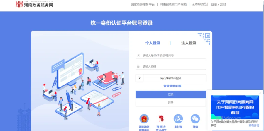 (2)点击右上角按照提示要求进行用户登录或注册(无政务服务网账号)、(已有政务服务网账号),如下图: