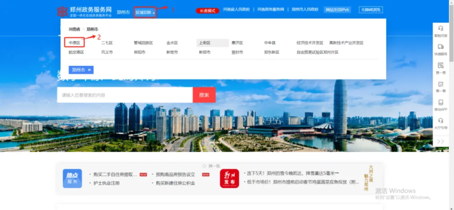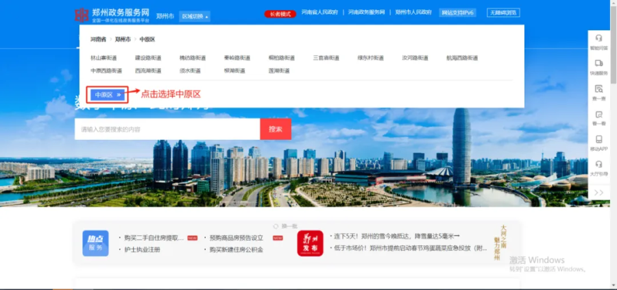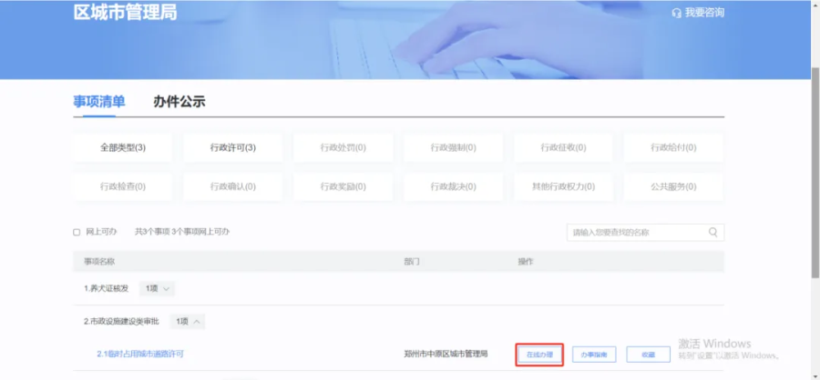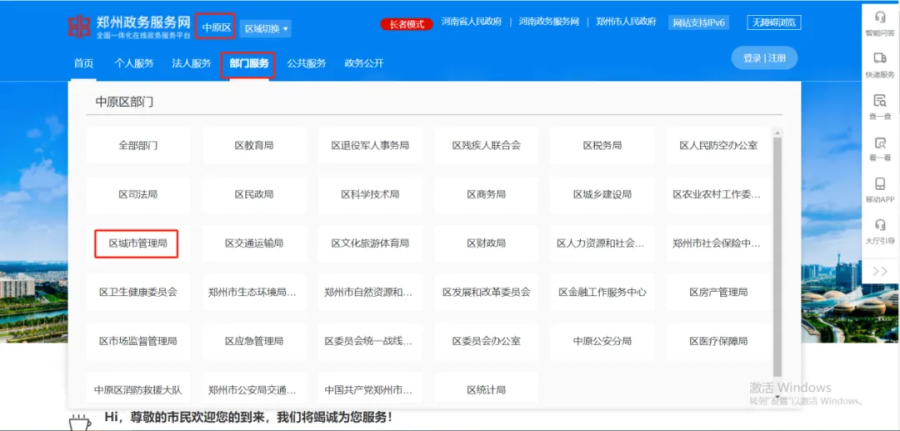 (5)确定后在中原区分厅选择“部门服务”-“区城市管理局”