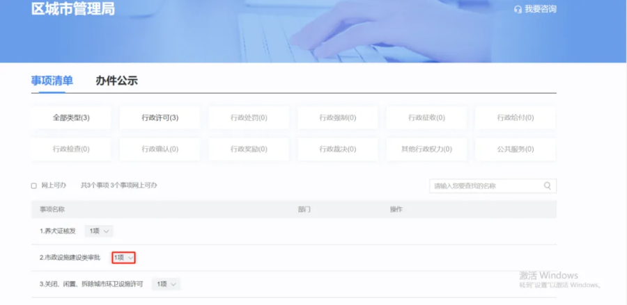 进入区城市管理局事项清单页面,鼠标下滑页点击择事项列表中“市政设施建设类审批”主项后的下来小三角。
