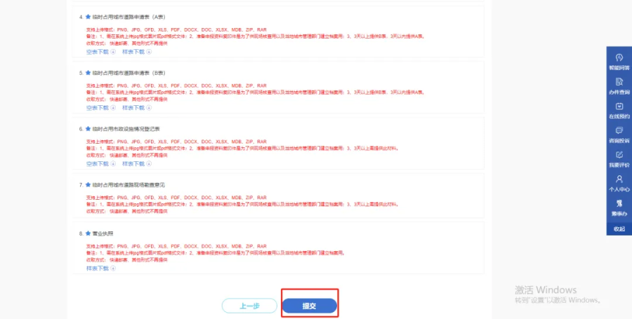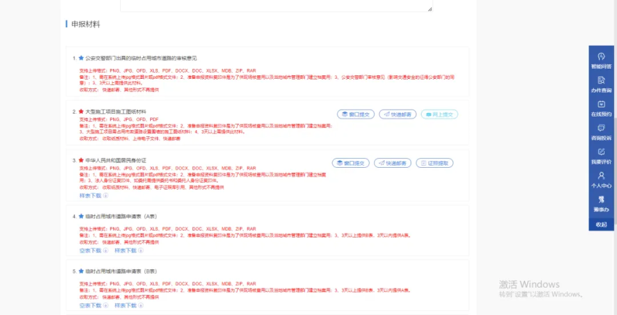 (10)查看需要提交的申报材料,根据实际情况进行网上提交或者快递邮寄或到线下打通窗口进行提交,如下图: