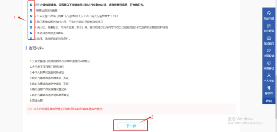 (8)查看审批条件,符合的全部勾选,如有不符合的暂无法申请,符合申请条件并全部勾选后,点击下方的“下一步”,如下图: