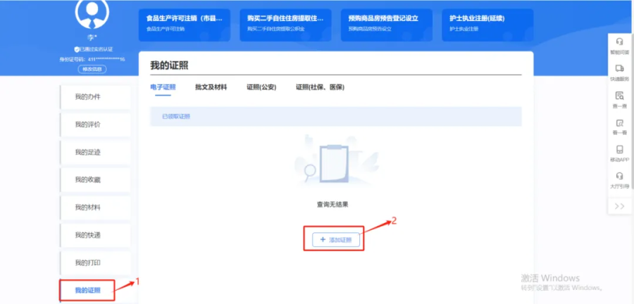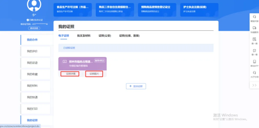(3)点击“+添加证照”查看是否有可领取电子证照(正常情况下区城市管理局审核许可并核发电子证照后10分钟可领取),如下图: