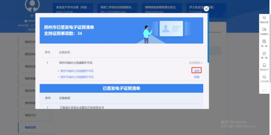 (4)如有可领取的电子证照,点击“查看全部”-“领取”进行领取电子证照,如下图:
