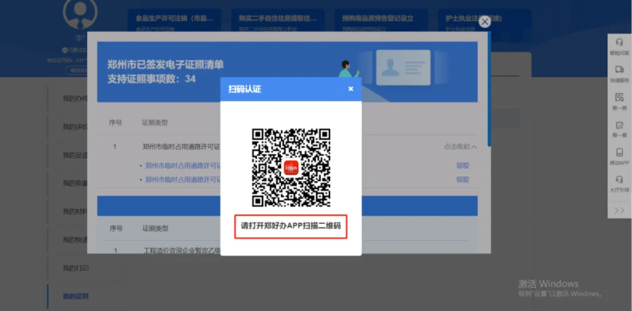 (5)点击电子领取后,使用郑好办扫码弹出的二维码进行人脸识别后即可领取到电子证照,如下图: