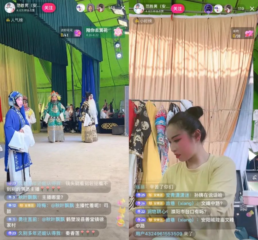 范胜男和剧团在村里唱戏,同步直播,演出结束后还会带网友走进幕后