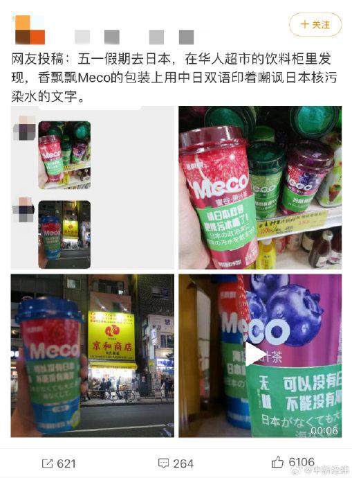 事件源起于5月3日有网友晒出,日本某商店销售的香飘飘旗下MECO果茶产品的杯托上,印有嘲讽日本排放核污水的标语,内容包括“请日本政客把核污水喝了”等。香飘飘投资者热线相关人员表示,该事件为员工个人行为。