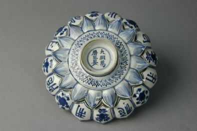 瓷洗整体呈莲花状,以4层64瓣莲瓣组成一朵青莲造型。洗身由双层莲瓣塑成,每层16瓣,内瓣下凹,外瓣凸起,均描绘青花。瓷洗以立体的莲瓣为形,底心绘有圆形开光,开光内外分饰两层相向的如意头花纹,内置梵文,上层16瓣莲瓣开光内壁绘有螺旋纹,外壁饰梵文及折枝花纹,下层16瓣莲瓣开光内壁绘有海石榴及花筋纹。圈足底,底足上双圈弦纹内有“大明万历年制”六字楷书款。