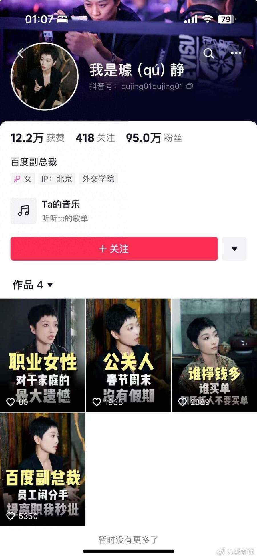 公开资料显示,璩静2021年8月入职百度担任公关副总裁,负责集团公众沟通部工作。九派财经注意到,早在5月1日,璩静就已开始在其自媒体账号发布短视频,内容涉及员工管理、职场规则、公关工作强度和职业女性等话题。