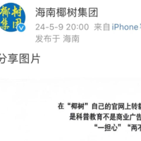 据东方网报道,5月9日,海南椰树集团发文表示“不服”,称相关广告是科普教育,不是商业广告,并表示“法无禁止即可为”。并表示了“担心”,担心名牌被毁,砸掉“椰树”及上下游企业两万员工饭碗,让海南50万椰农椰子卖不出去脱富返贫。