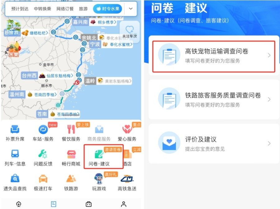 5月9日,中国铁路客户服务中心在动车组“铁路畅行码”上的“问卷建议”栏,推出《铁路旅客高铁宠物运输调查问卷》,包括旅客是否有通过高铁运输宠物的需求、运输宠物的类型、时间次数、定价标准、防护措施、意见建议等15个问题,引发关注。