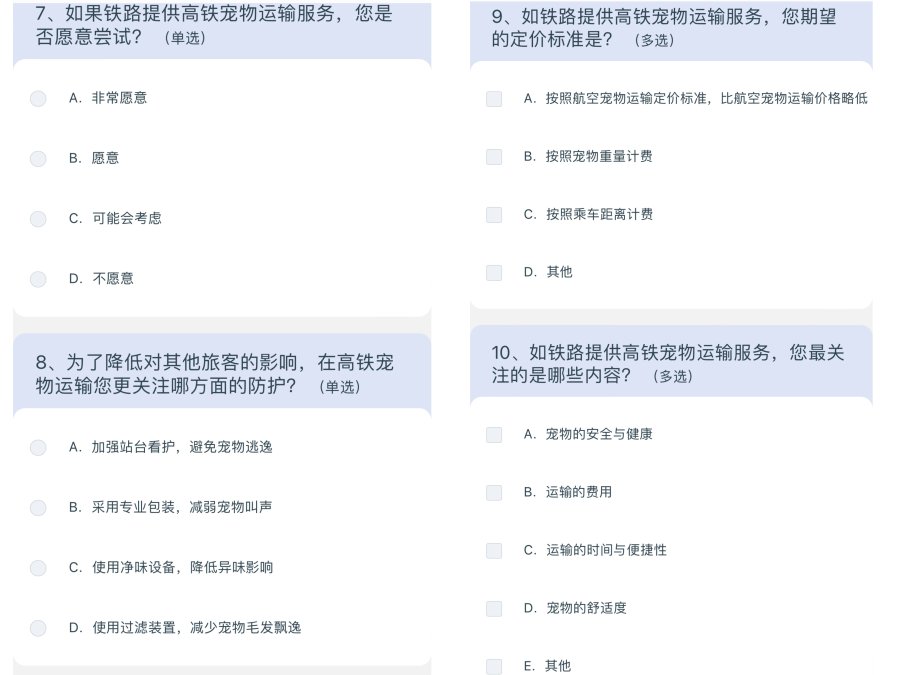 还有一些关于高铁宠物运输服务的假设性问题,“如铁路提供高铁宠物运输服务,您期望的定价标准是?”“如果铁路提供高铁宠物运输服务,您是否愿意尝试?”“如铁路提供高铁宠物运输服务,您最关注的是哪些内容?”
