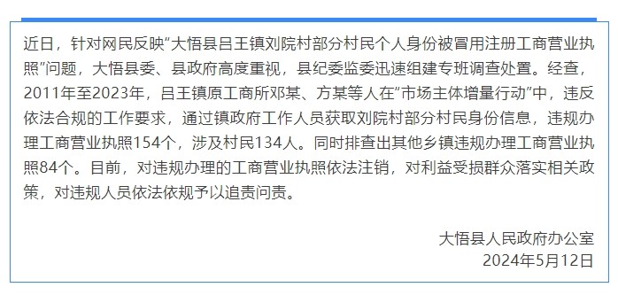 据孝感日报消息,大悟县人民政府办公室5月12日发布通报:近日,针对网民反映“大悟县吕王镇刘院村部分村民个人身份被冒用注册工商营业执照”问题,大悟县委、县政府高度重视,县纪委监委迅速组建专班调查处置。经查,2011年至2023年,吕王镇原工商所邓某、方某等人在“市场主体增量行动”中,违反依法合规的工作要求,通过镇政府工作人员获取刘院村部分村民身份信息,违规办理工商营业执照154个,涉及村民134人。同时排查出其他乡镇违规办理工商营业执照84个。目前,对违规办理的工商营业执照依法注销,对利益受损群众落实相关政策,对违规人员依法依规予以追责问责。