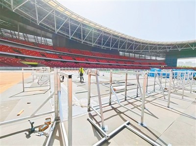 工作人员正在郑州奥体中心体育场进行场地搭建