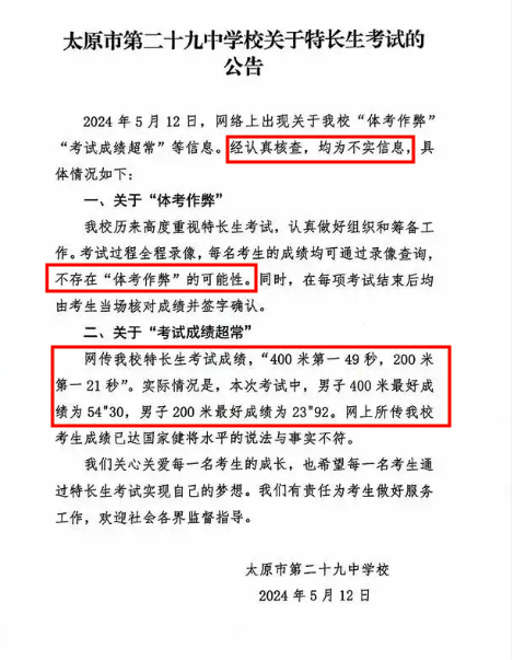 5月12日,网传山西太原市第二十九中学特长生考试出现作弊现象,有体育特长生花30万元内定第一名。12日晚,太原市第二十九中学发布公告称,网传信息均为不实信息。考试过程全程录像,每名考生的成绩均可通过录像查询,不存在“体考作弊”的可能性。