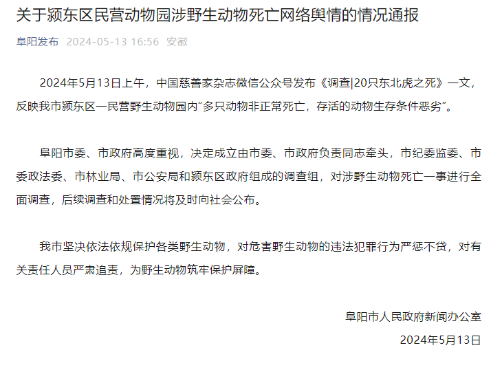 2024年5月13日上午,中国慈善家杂志微信公众号发布《调查|20只东北虎之死》一文,反映我市颍东区一民营野生动物园内“多只动物非正常死亡,存活的动物生存条件恶劣”。