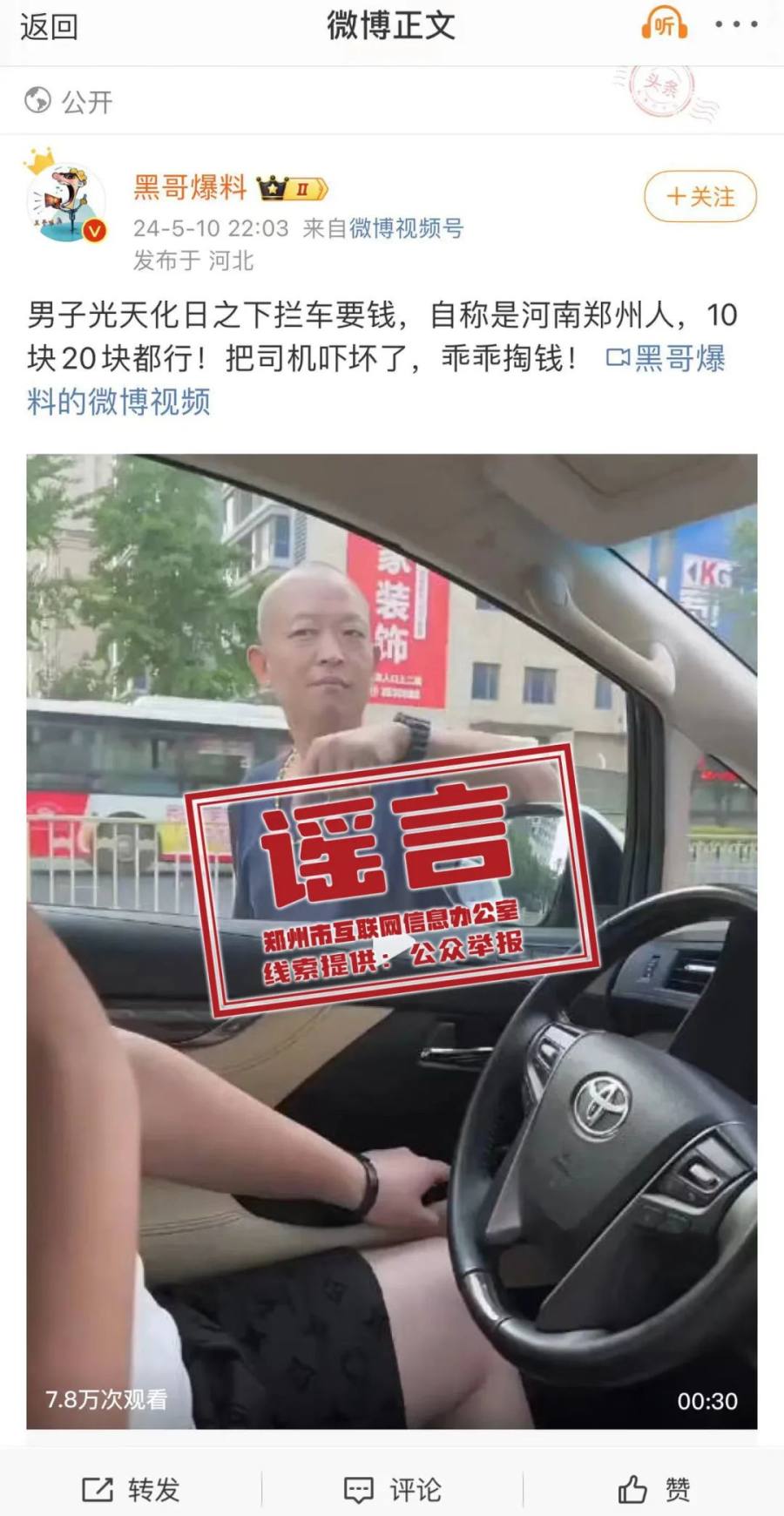 近日,网传一男子在马路上拦车要钱,该男子声称郑州人。经有关部门核实,当事人非郑州人,事发地也不在郑州。按照中央网信办“清朗”系列专项行动要求,请有关媒体平台账号和广大网民停止传播失实信息。