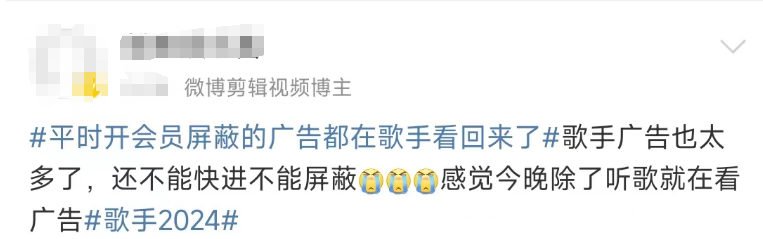 值得注意的是,首期节目就加入了不少广告,且因为这档节目以“直播”的形式播出,所以有网友称,“广告既不能快进也不能屏蔽”“平时开会员屏蔽的广告,都在‘歌手’看回来了”。因此,随着越来越多的品牌“申请出战”,有用户不免担忧:后续节目增加更多广告是否会影响观看体验?