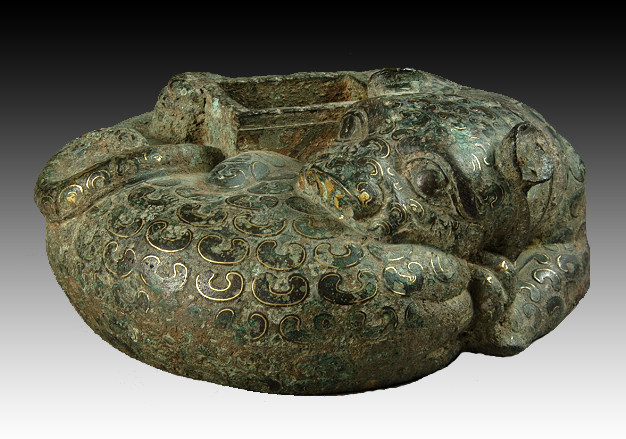 错金豹形器座,青铜器,战国文物,器座通高11.2厘米、宽24厘米,銎口长6.5厘米、宽4厘米,1958年河南省三门峡市陕县观音堂村出土。