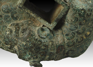从器物造型上看,错金豹形器座整体似一盘卧的豹子。豹子侧身盘卧,头部搭于后腿之上。鼻子隆起,露出两鼻孔;大眼微凸,略向上视;浓眉凸起;近圆形双耳中间内凹。颈部戴扁带形项圈。