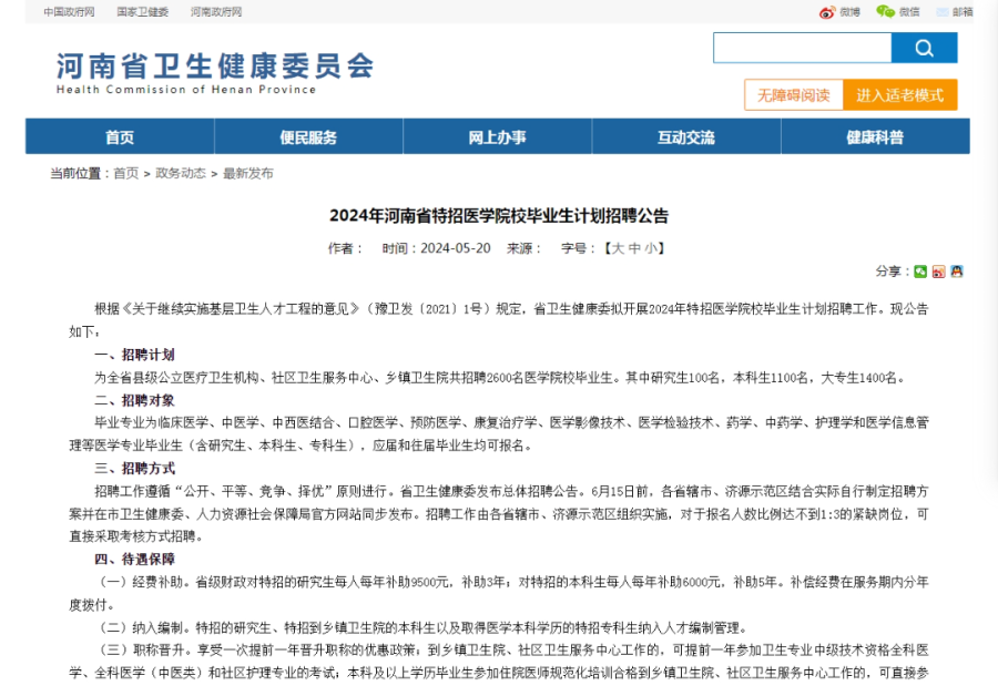 根据《关于继续实施基层卫生人才工程的意见》(豫卫发〔2021〕1号)规定,省卫生健康委拟开展2024年特招医学院校毕业生计划招聘工作。现公告如下: