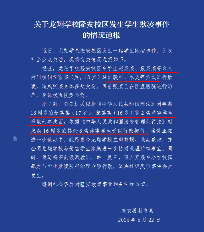 行为之恶劣,心性之狠毒,实在是超出了成年人的认知,而这些人还都是未成年人。受害者身上的疤痕可能再难根除,必须要让霸凌者也付出代价。目前,隆安县教育局已经发布了情况通报,参与泼热水的学生共有8人,其中2名年满16岁的学生已被警方刑事拘留,6名未满16岁的学生被行政拘留。