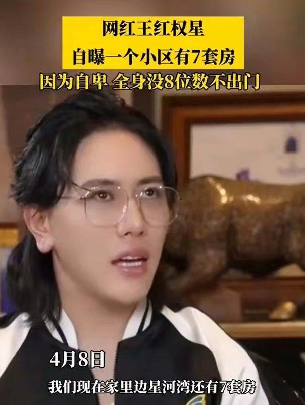 公开信息显示,王红权星本名王洪全,1993年12月出生于河北唐山,其抖音账号拥有437.4万粉丝。其在直播时,曾自曝在北京星河湾小区拥有7套豪宅,全身没8位数不出门,“我每天出门的情况下,如果身上的打扮加在一起没有8位数,我肯定是不可以的,我家最大的一套991平方,但房子位置遮阳光就空置了。”王红权星说。