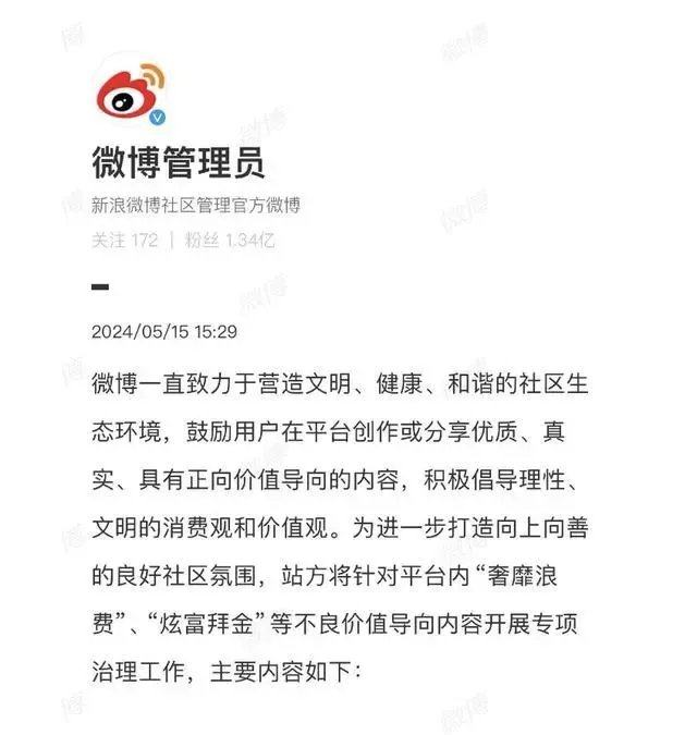 5月15日,腾讯、抖音、快手、微博、b站、小红书等平台发布不良价值导向内容专项治理公告,针对近期网络上出现的“奢靡浪费”“炫富拜金”等问题,各平台从严打击,倡导理性、文明的消费观和价值观。