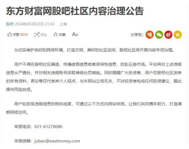 东方财富网股吧社区发布公告称,为切实维护良好的网络环境,打造文明、美好的社区空间,股吧社区将开展内容专项治理。