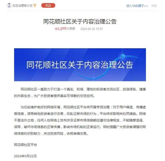 同花顺社区平台也发布公告称,为切实维护良好的网络环境,同花顺社区平台将开展专项治理:对于用户编造、传播虚假信息,误导其他投资者进行交易,扰乱证券市场的行为,平台将采取相关处罚措施。