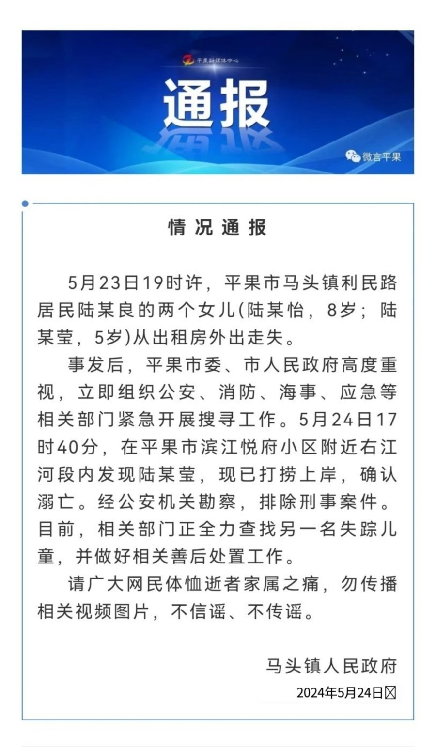 5月24日,广西平果马头镇政府发布通报:5月23日19时许,平果市马头镇利民路居民陆某良的两个女儿(陆某怡,8岁;陆某莹,5岁)从出租房外出走失。事发后,平果市委、市人民政府高度重视,立即组织公安、消防、海事、应急等相关部门紧急开展搜寻工作。5月24日17时40分,在平果市滨江悦府小区附近右江河段内发现陆某莹,现已打捞上岸,确认溺亡。经公安机关勘查,排除刑事案件。目前,相关部门正全力查找另一名失踪儿童,并做好相关善后处置工作。