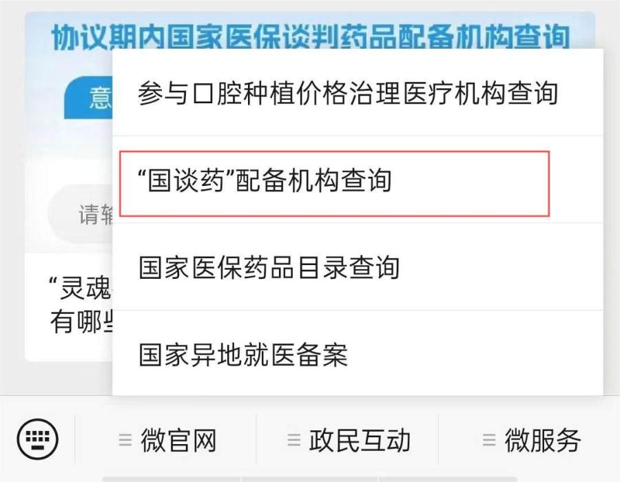 第一步:进入“国家医保局”微信公众号,点击微服务→“国谈药”配备机构查询,进入查询页面。
