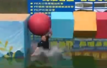 昨天的节目内容里,一名小伙子逆行跑过急转的跑步机,冲过第一关,在踏上翻滚积木时落水。