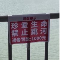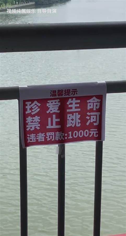 26日,多个社交账号发帖称,有人在当地桥上悬挂“珍爱生命,禁止跳河,违者罚款1000元”的警示牌。