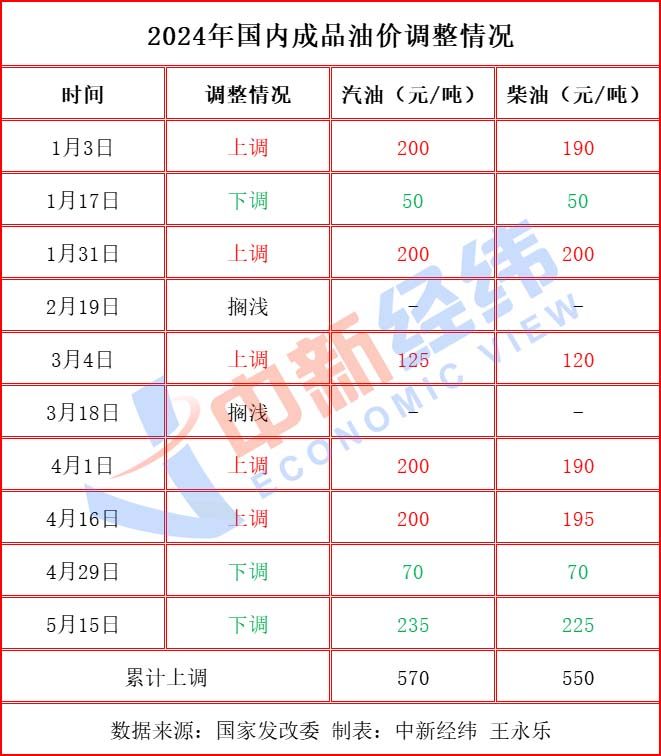 中新经纬梳理发现,年内成品油价已经历十轮调整,呈现“五涨三跌两搁浅”。国内汽、柴油价格每吨较去年底分别提高570元、550元。若本轮油价下调,则将出现“三连跌”走势;若不调整,则是时隔近两个半月后再次搁浅。