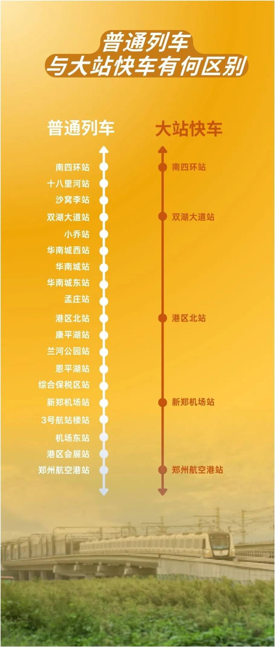 结合前期问卷调查结果,根据2号线与城郊线客流特点,郑州地铁已通过多轮测试,试行了城郊线“大站快车”运营组织模式。自5月29日起,郑州地铁2号线与城郊线在工作日期间开行南四环站至郑州航空港站双向“大站快车”。