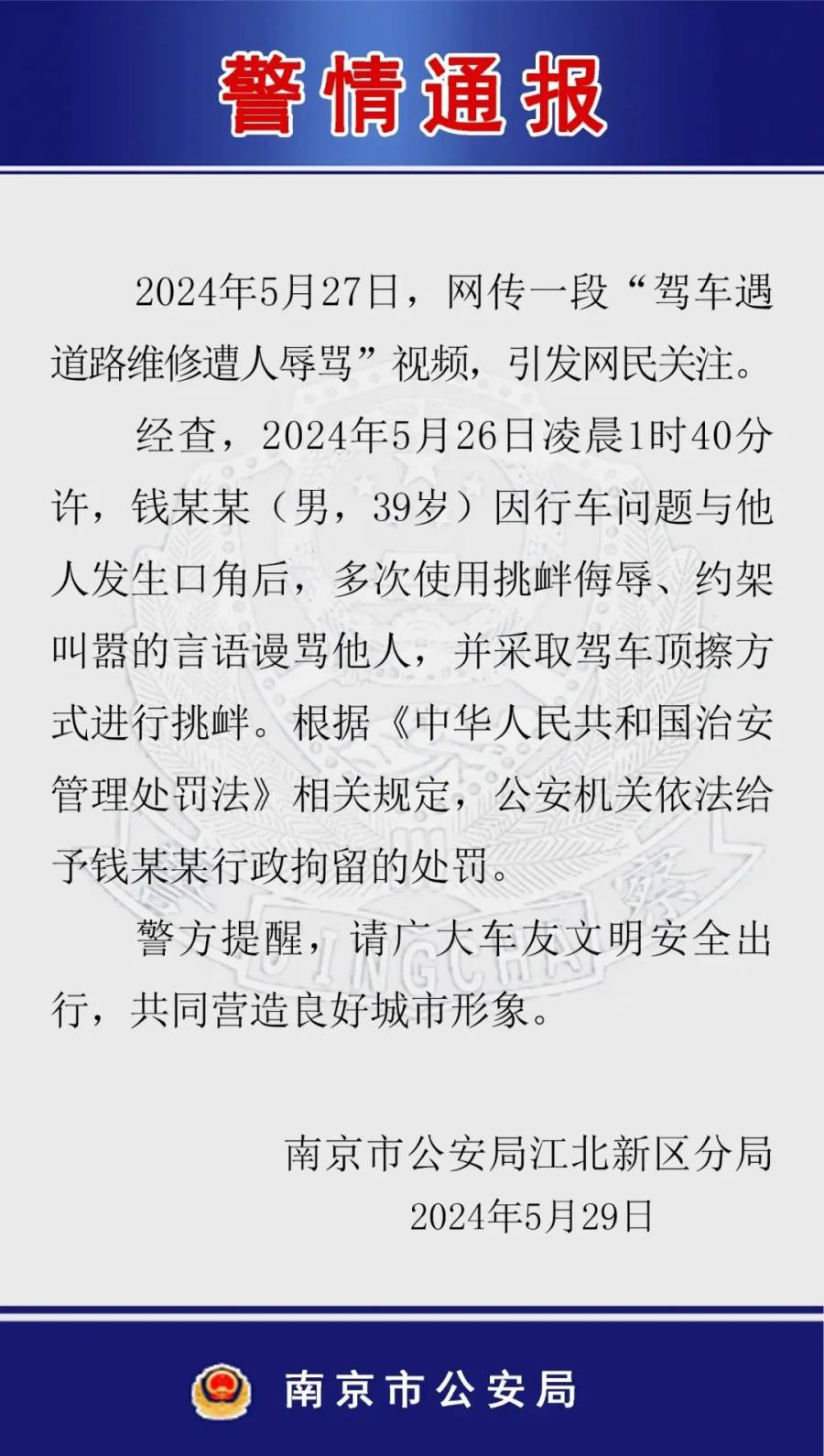 辱骂威胁车主“滚出南京”,警方通报:拘留