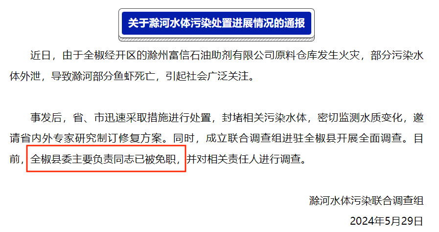 5月29日,滁州市就此事发布情况通报,全椒县委主要负责同志被免职,并对相关责任人进行调查。