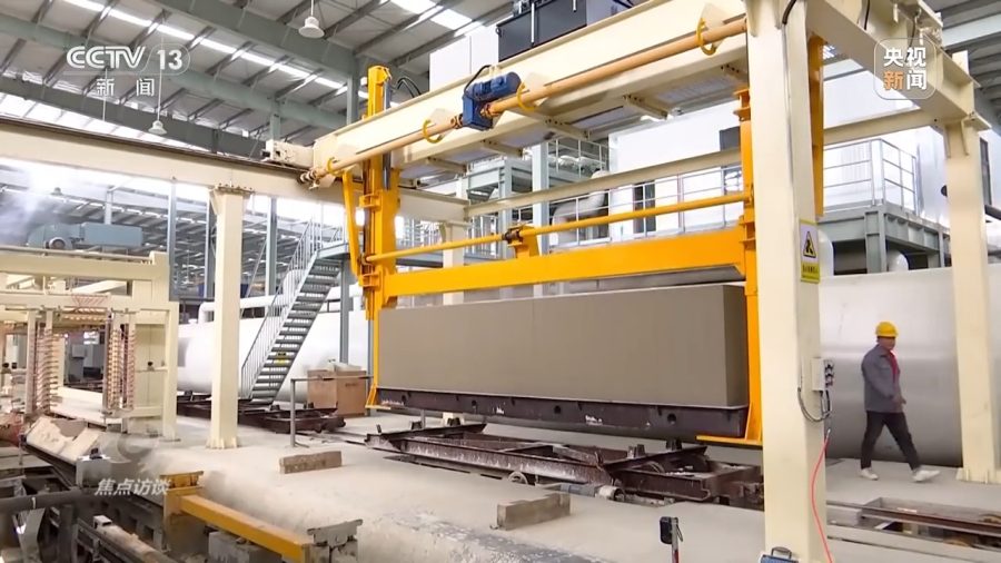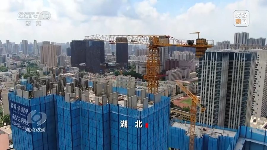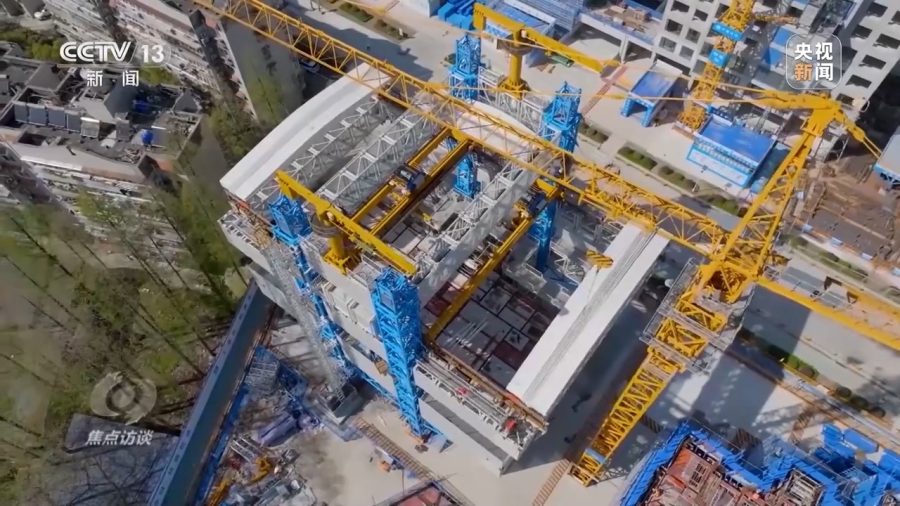在湖北一家工厂,标准化施工构件由工厂生产交付后,再由高空造楼机像拼积木一样,将它们快速精准吊装。这样装配式一体化的施工方式,能让单栋楼的总工期节约近两个月。