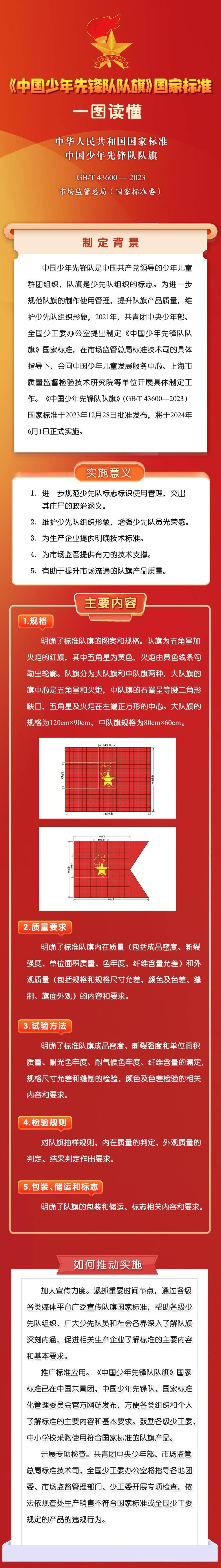 《中国少年先锋队队旗》国家标准对队旗的质量要求、试验方法、检验规则、包装、储运和标志等方面作出了明确规定,对队旗的图案、色牢度、规格和规格尺寸允差、颜色及色差、缝制、旗面外观等方面提出了具体细化指标。