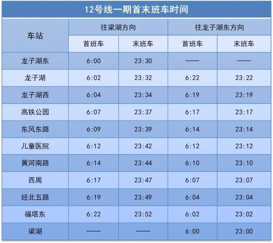 自5月30日起,郑州地铁12号线一期黄河南路站、福塔东站首末班车时间微调,请市民乘客合理安排出行时间。12号线一期车站具体首末班车时间如下: