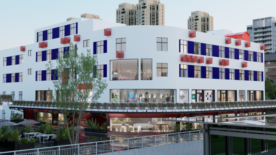 空间上,通过斜向插入的设计方式,大大增加了每个店铺的昭示形象,展现出各商户的革新,增强了品牌间的差异体验,露台、挑空与天井相互衬托,形成了空间为展,品牌为展品的独特视觉。
