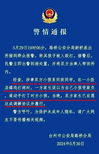 5月30日,浙江台州市公安局路桥分局通报此事称,涉事双方小孩系同班同学,在一小饭店嬉戏打闹时,一方家长误以为自己小孩受欺负,遂动手打了对方小孩。当晚,双方家长已自愿达成调解协议并履行。