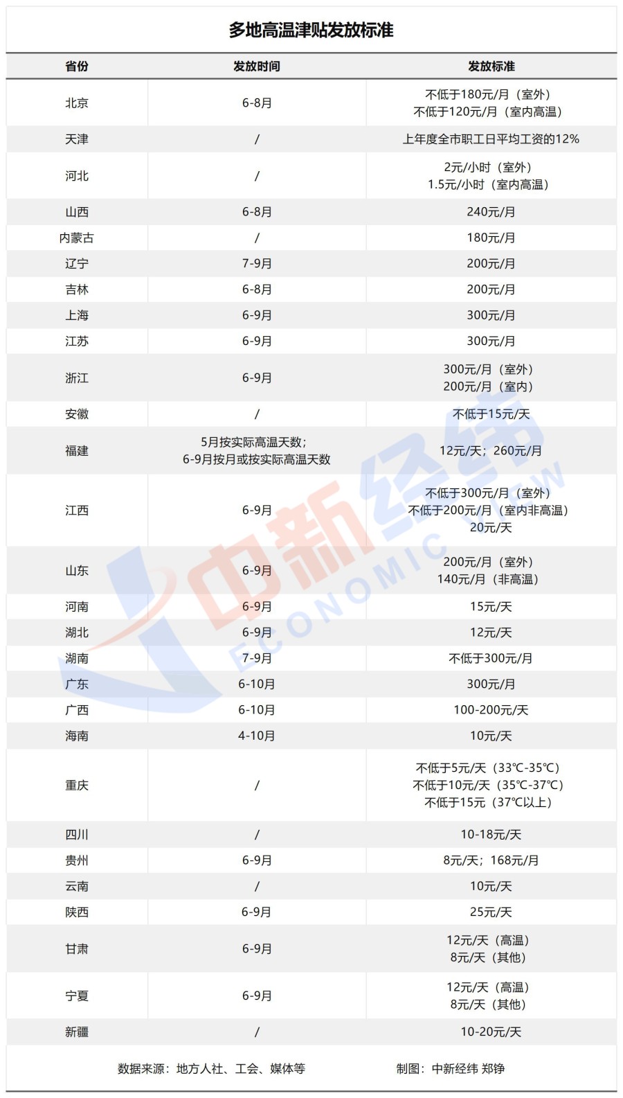 其他大部分地区高温津贴发放时间则为6-9月,共4个月。此外,北方地区如北京、山西、吉林等地津贴在6-8月发放,共3个月。