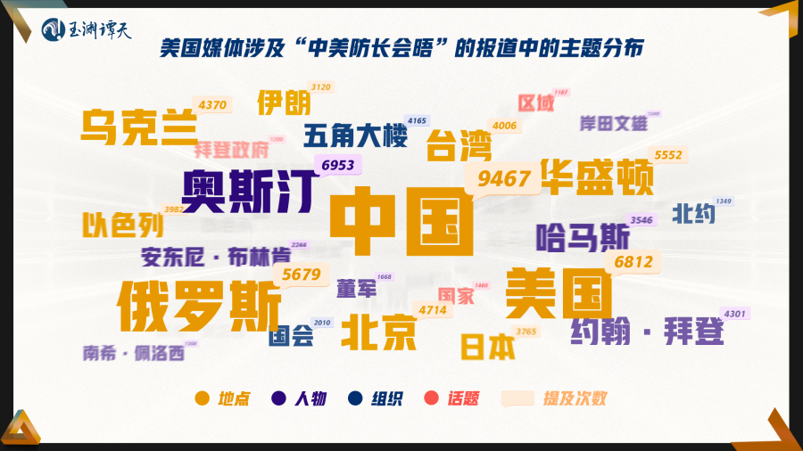 对今年以来美国媒体涉及中美防长会晤的报道进行主题分析后,可以发现其中既包括巴以冲突、乌克兰危机等国际和地区问题,也包括台湾、南海等涉及中方核心利益的议题。