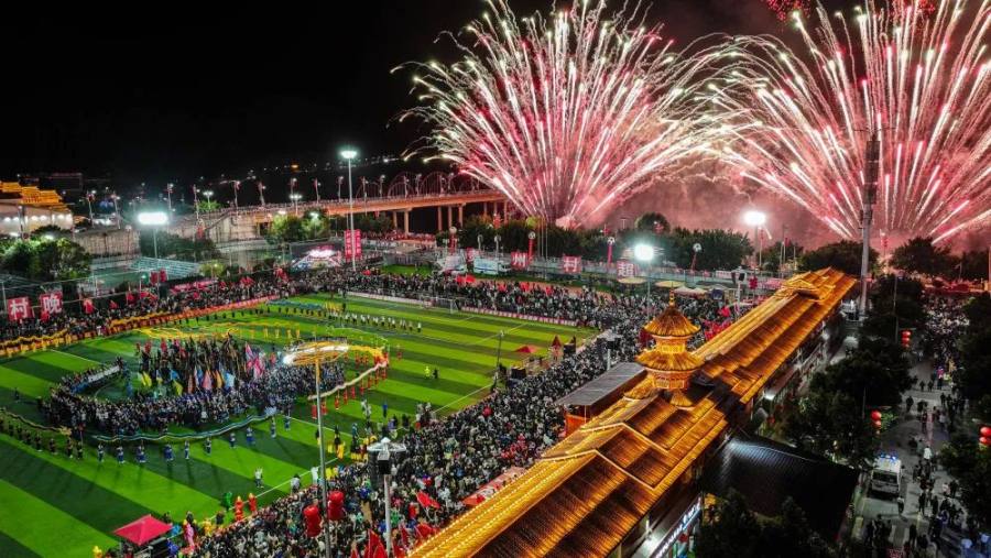 在贵州省榕江县举行的2024全国“村晚”示范展示活动暨贵州“村超村晚”活动中,音乐烟花秀精彩上演(2024年2月3日摄,无人机照片)。新华社记者 刘续 摄